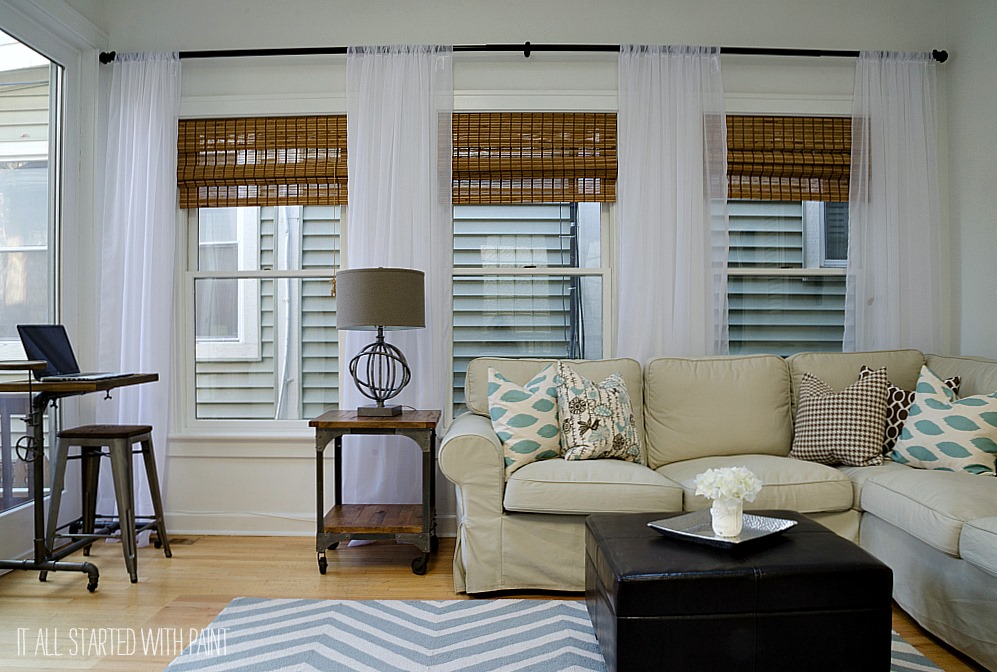 Lambert Table Lamps from Birch Lane | Sheer Curtain Panels from Curtainworks | Ektorp Sectional with Tygelsjo beige slipcover from Ikea | Storage Ottoman from Walmart | 30” Clock from Wayfair | Premier Prints Fabrics from OnlineFabricStore.net | Brown Houndstooth Fabric from Buyfabrics.com | Side tables from Cost Plus World Market | Laptop Desk from Cost Plus World Market | Industrial Stool from Target | Chevron Rug from RugsUSA | Television Console/Armoire from Pottery Barn (from 14 years ago) | Unfinished Wood Crates from Amazon.com | Vintage Crate from Found In Attic | Regal Select Off-the-Shelf Base White Paint in flat (walls) and semi-gloss (trim) from Benjamin Moore