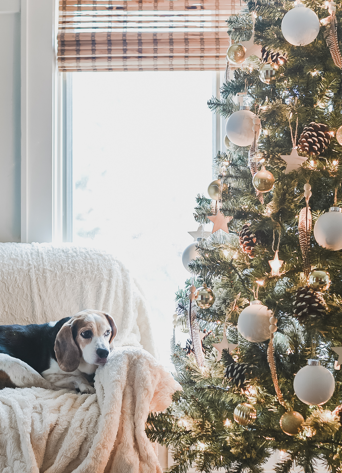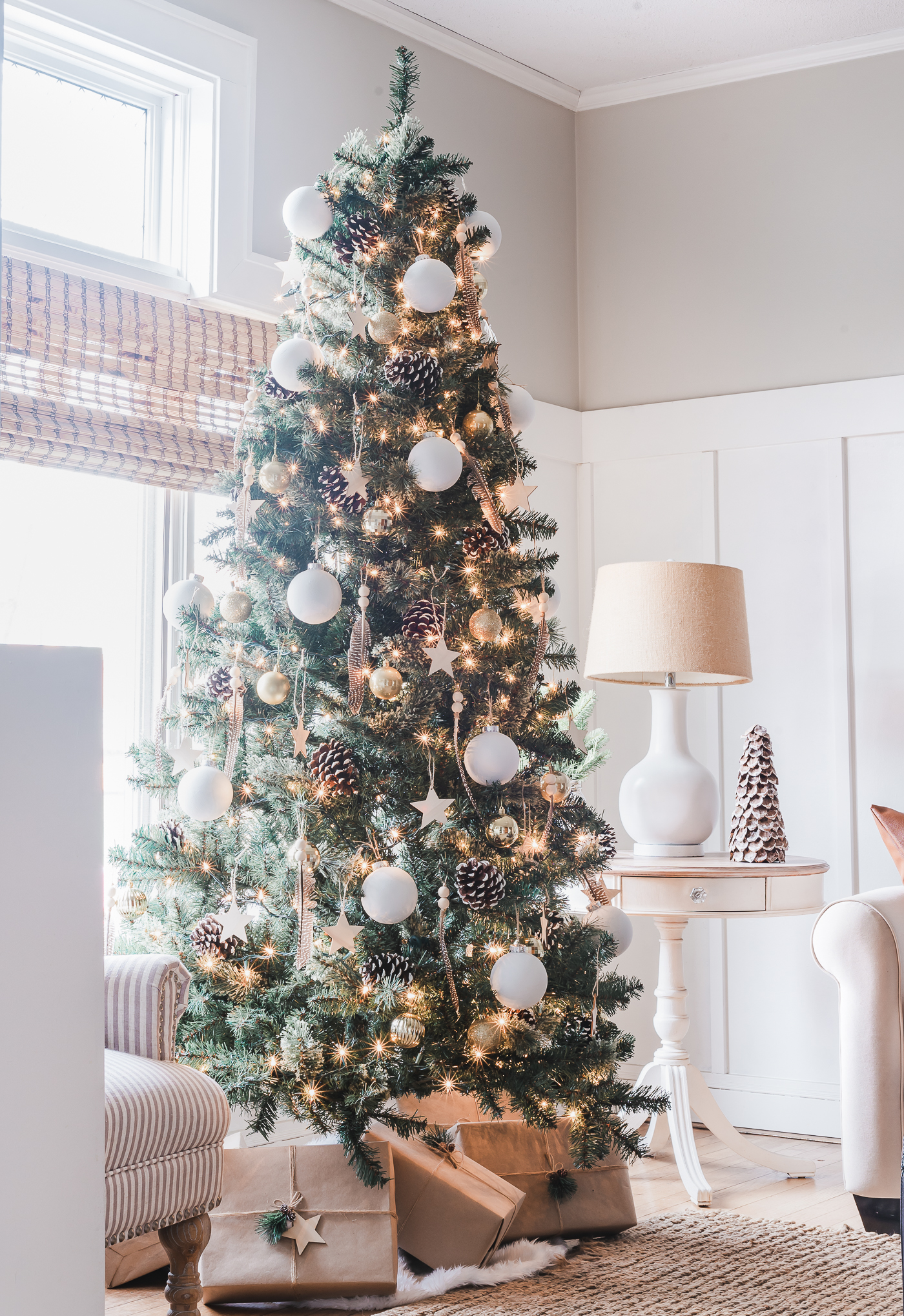 Boho Christmas Tree Design – Christmas Tree with White Balls, Painted PIne Cones, Feather Ornaments.