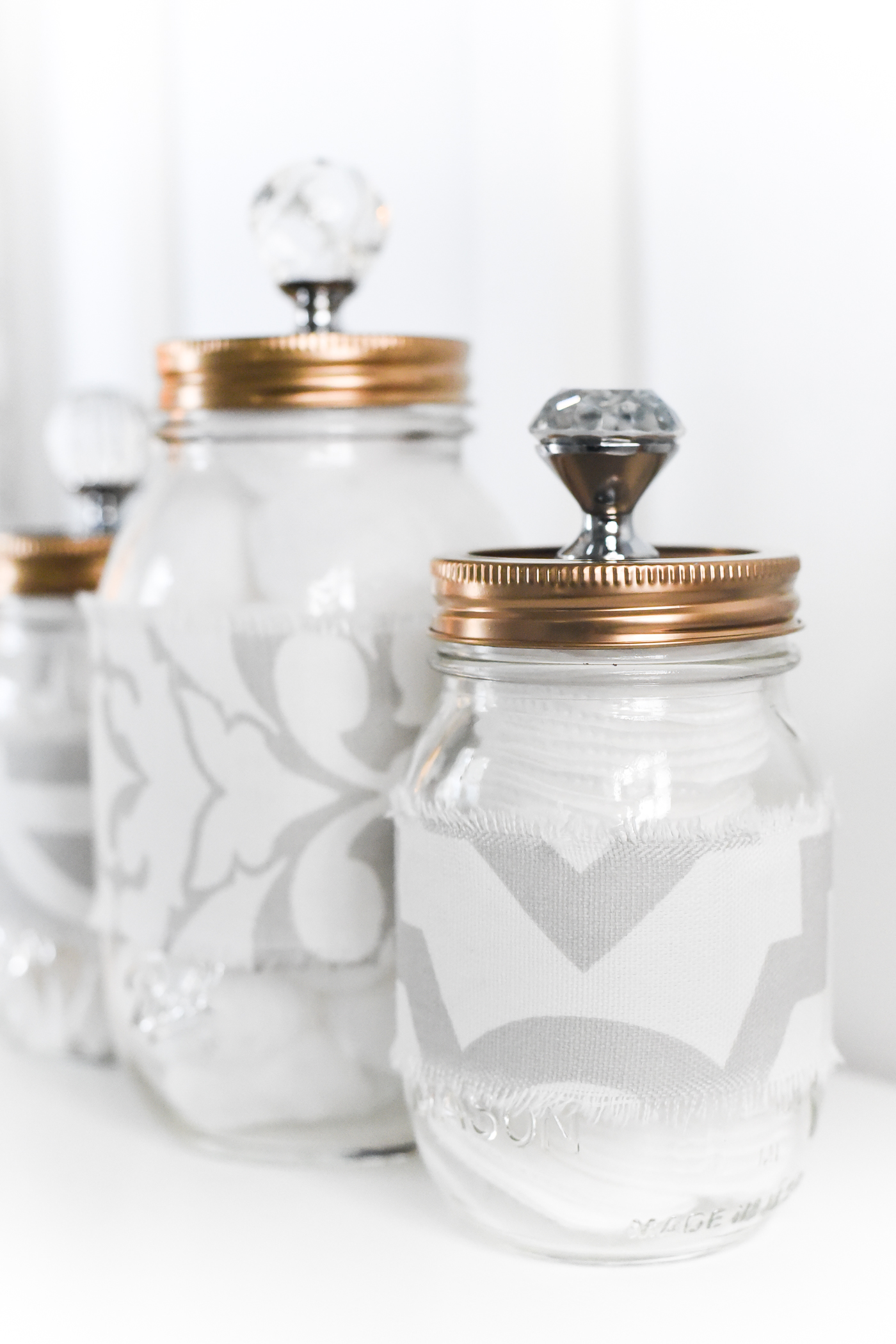 And, in the meanwhile, I’m sharing how to add some pretty gray and white bathroom accents with fabric mason jar cozies bathroom storage with glam gold tops with crystal knobs.