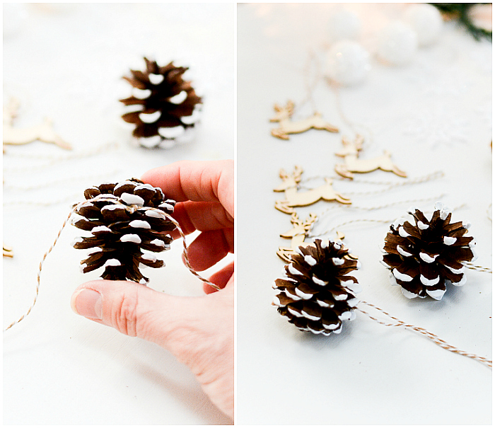 I first painted the pine cones (click here) and then tied a length of baker’s twine.