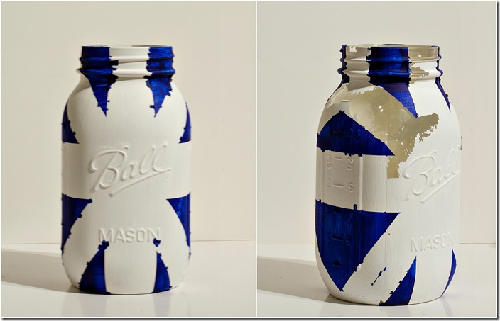 Step-by-step tutorial on how to make painted and distressed Union Jack flag mason jar.