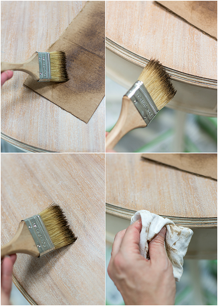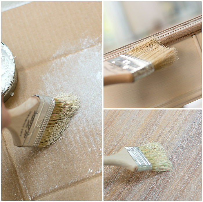 For the third layer, I used Amy’s 2.5″ bristle brush. I loaded up the brush with liming wax and then offloaded most onto a piece of cardboard. Then using a cross hatch motion, I moved the brush along the table top and the edges.